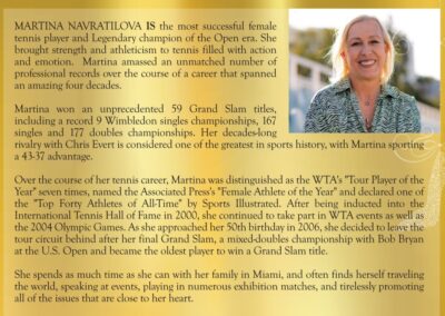 There’s about a month and a little left before The Thurston Reception Awards Dinner where we hope to honor 59 Grand Slam winner, (most Grand Slams for male or female) Martina Navratilova. As most of you know she publicly announced earlier this year that she had been diagnosed with breast & throat cancer Stage 1, and that she will be getting treatment immediately. She has just shared with me that she is doing fine and feeling very confident that she will defeat this opponent and that she’s looking forward to attending our March 11 Awards. I know we all send our best wishes and prayers on her difficult journey ahead.