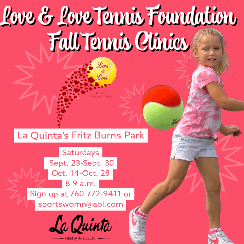 The Love & Love Tennis Foundation will return to Fritz Burns Park in La Quinta with a series of Saturday clinics on Sept. 23, 30, and Oct. 14, 21 and 28.