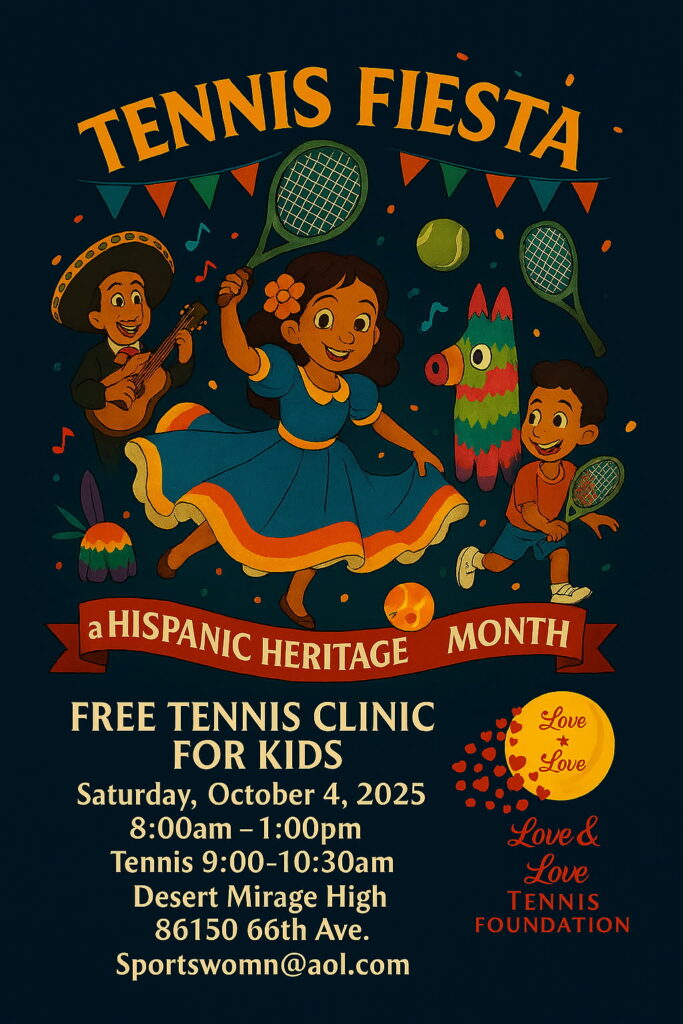 The Love & Love Tennis Foundation & The Latin American Tennis Foundation are celebrating Hispanic Heritage Month with a free tennis clinic. We’ve got 60 to 80 elementary & middle school kids in the CVUSD coming out to Desert Mirage High School. The tennis is from 10–11:30am.